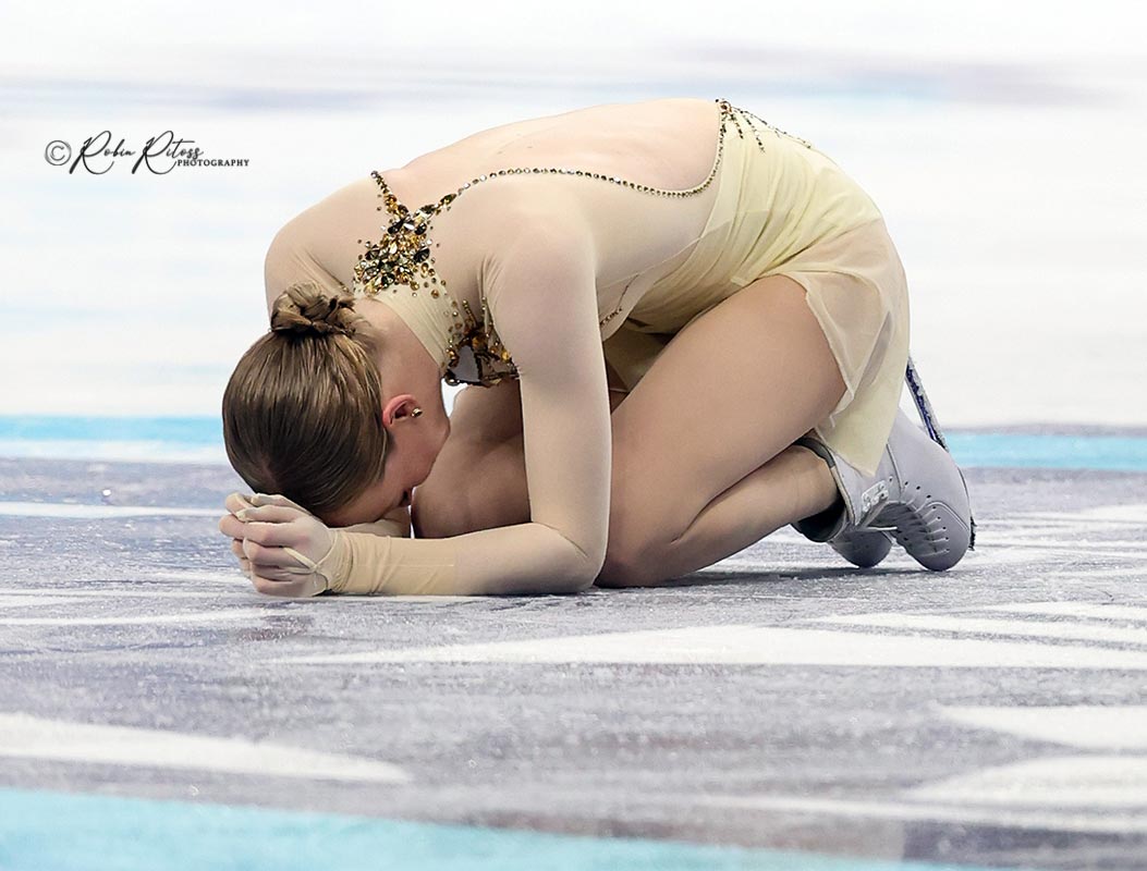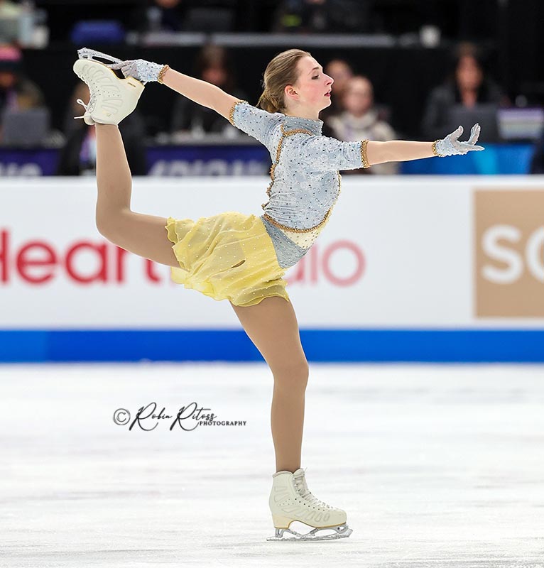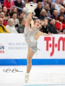 Glenn was the leader after the short program, less than two points ahead of reigning World champion Alysa Liu. (something else about SP). In her “I Will Find You” and “The Return” free skate, Glenn landed a triple Axel, which was called slightly under-rotated. She cleanly landed a triple flip-triple toe combination, along with a triple loop-double Axel-double Axel sequence. Her only other mistake was with her triple loop, which was called under-rotated. She earned a free skate score of 150.50, which was first in the segment, and a total score of 233.55 to win the event.