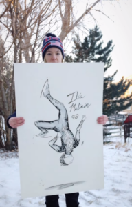 Throughout the season, Hilmer collected reference photos of skaters in contention for the Olympic team from Instagram, skating news websites, and skating photographers, including Figure Skaters Online’s own Robin Ritoss. Then, she’d create a sketch of the skater or team based on the photos, before scanning it into Photoshop on her computer. In Photoshop, she went over the drawing with the brushstrokes that she would eventually do on paper – almost like a rough draft. Next, she’d use a projector to impose that Photoshop image on the actual paper to trace the outline of her sketch and add the actual brushstrokes on the paper.