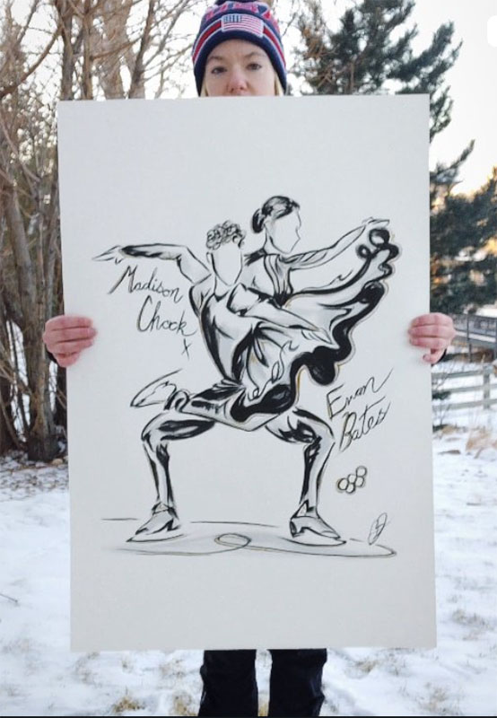 “It was a grind, but it was great,” Hilmer said. “The first one finished was [ice dancers Madison] Chock and [Evan] Bates, and it gave me a chance to do a team on that paper and see how that fit in those dimensions. I had a number of sketches [of skaters] that I kept leading up until Nationals, and then when they announced the team, I picked who I needed and moved forward from there.”